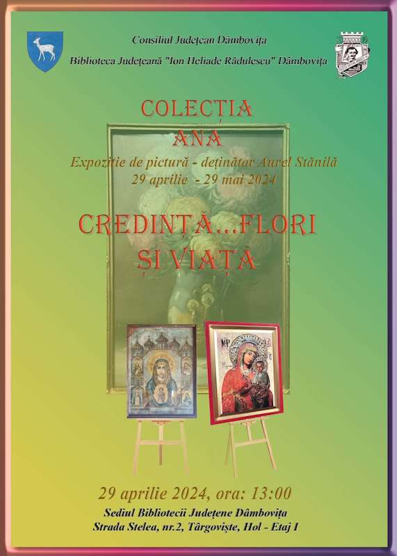 Luni, 29 aprilie 2024, ora 13.00, Biblioteca Județeană I.H. Rădulescu Dâmbovița organizează vernisajul expoziției de pictură - Credință…flori și viață - Colecția ANA - deținător Aurel Stănilă.